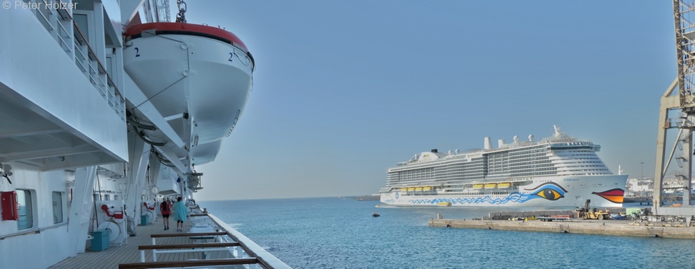 Die AIDAnova (Baukosten: 950.000.000 US$) mit ca. 5.000 Passagieren und 1.500 Mann/Frau Besatzung lag bereits an der Pier.