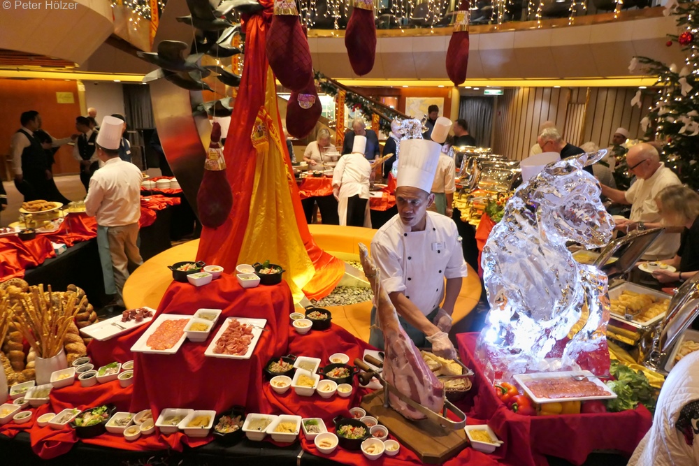 Nach dem Auslaufen um 21:00 Uhr wurde ein großes Tapas-Buffet im Foyer der ARTANIA für die ausgehungerten Reisenden eröffnet. Da wir erst um halb neun unser Abendessen beendet hatten, begnügten wir uns mit dem Betrachten der kleinen und großen kulinarischen Leckereien und der kunstvollen Deko.