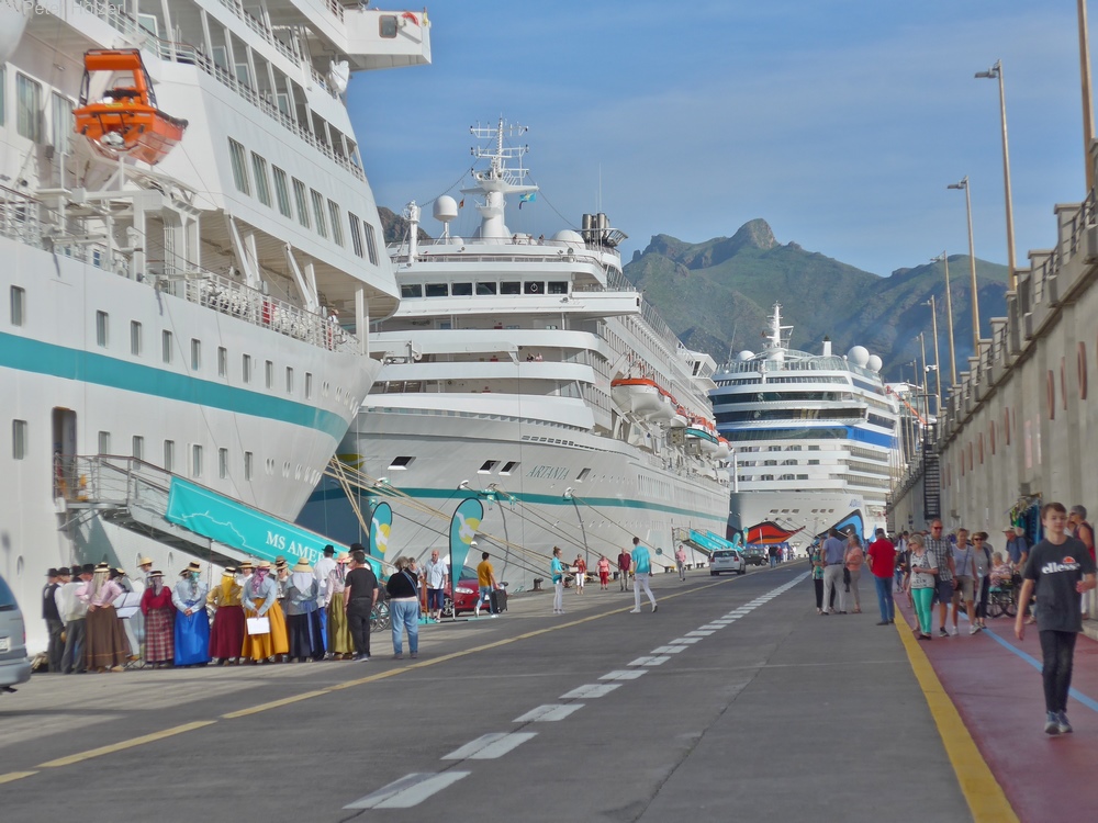 Ankunft um 8:00 Uhr im Hafen von Santa Cruz. Hier lagen bereits 5 andere Kreuzfahrtschiffe. Ob diese geballte Ladung an Kreuzfahrern für eine Hafenstadt dienlich ist, sei einmal dahingestellt.