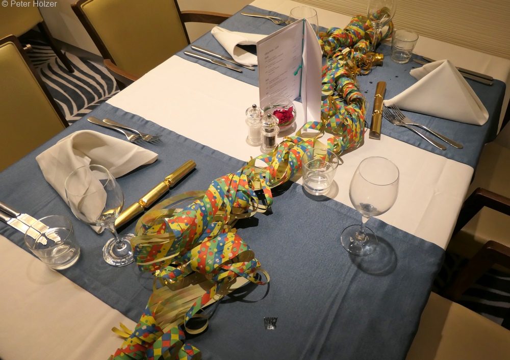 Gegen 18:30 Uhr mit ein wenig wehen Füßen ging es zurück auf die ARTANIA, wo schon das Weihnachtsgalaabendessen wartete – Gänsebraten.