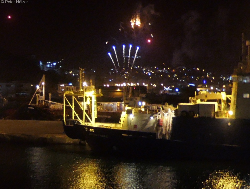 Alle im Hafen und auf Reede liegenden Schiffe begrüßten das Neue Jahr 2020 mit ohrenbetäubendem Tuten ihrer Schiffshörner und Schiffssirenen. Im Ort wurde eine großes 20-minütiges Feuerwerk abgebrannt.