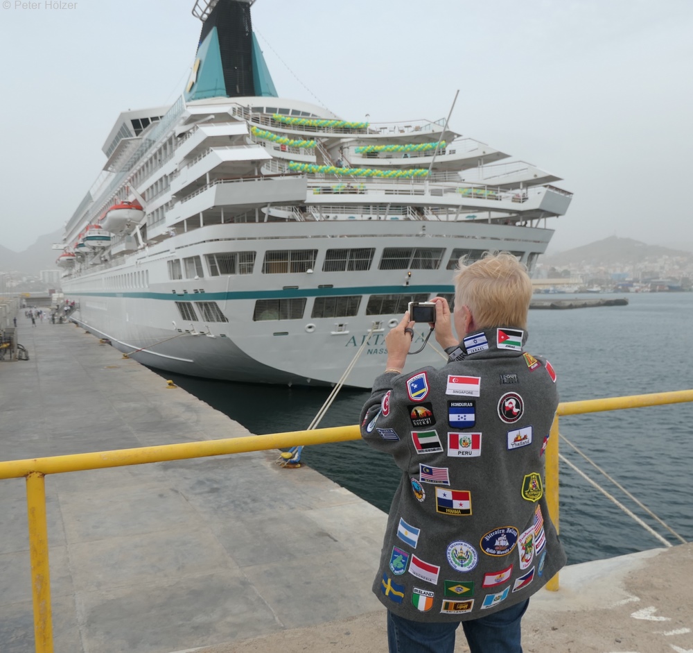 Heute konnten wir nicht pünktlich anlegen. Der Lotse hatte wohl verschlafen. Als die ARTANIA ca. 1-2 Seemeilen vor dem Hafen von Praia den Lotsen an Bord nehmen wollte, war keiner da. Über die üblichen Funkfrequenzen bekam der Kapitän auch keinen Kontakt zur Hafenbehörde. Erst per Handy gelang es, jemanden an die Strippe zu bekommen. Dort wurde versprochen, dass der Lotse in 8 Minuten an Bord kommen würde, eine äußerst sportliche Zeitprognose. Natürlich war kein Lotse nach 8 Minuten da, auch nicht nach 20 Minuten. Erneute Nachfrage, was denn los sei. Ja, das Lotsenboot hat einen technischen Defekt und kann nicht losfahren, aber der Lotse würde jetzt mit einem Schlepper zu ARTANIA gebracht.