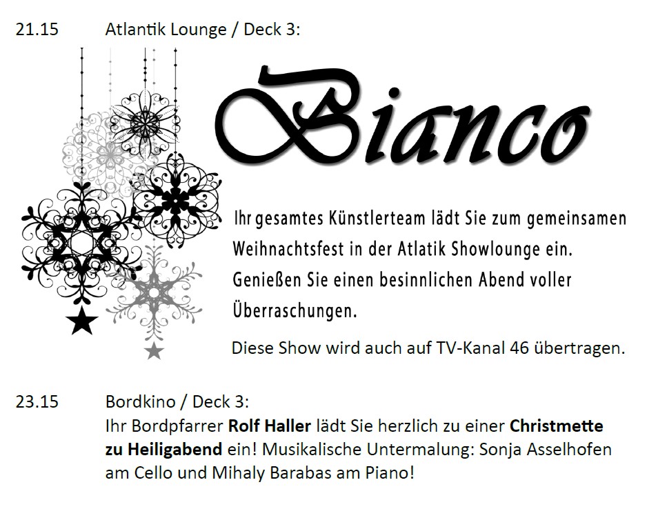 Statt vieler Worte, hier der Auszug aus dem Tagesprogramm, um zu zeigen, wie Weihnachten an Bord gefeiert wurde.