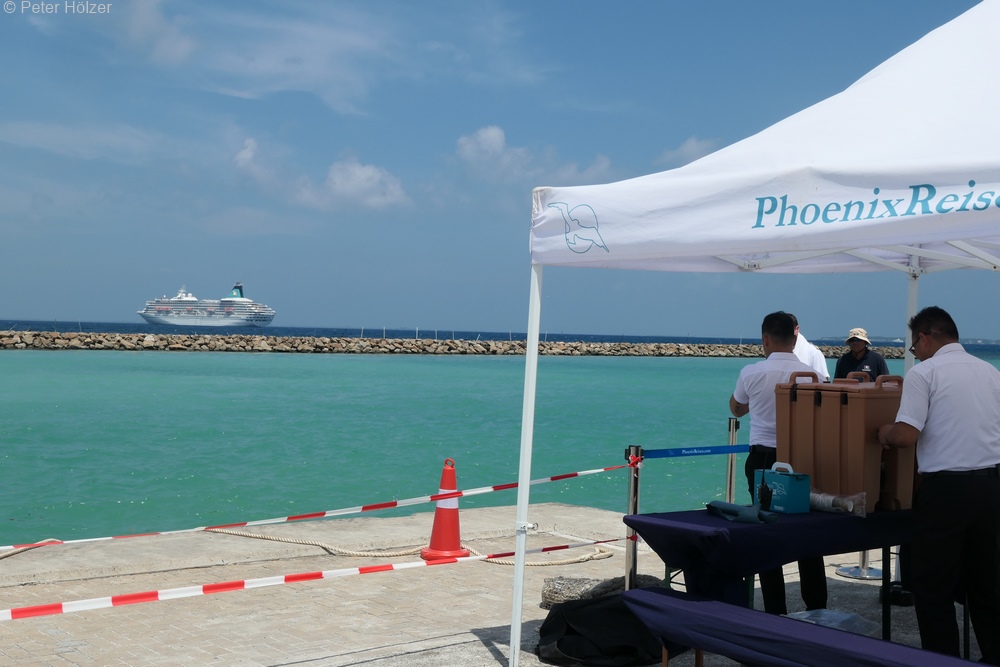 Gan ist die südlichste Insel der Malediven. Sie gehört zum Addu-Atoll und liegt etwa 40 Seemeilen südlich des Äquators. Mit ihren 2,2 km2 ist sie recht übersichtlich und bietet kaum Sehenswürdigkeiten. Deshalb hat Phoenix auch keine Ausflüge angeboten, nicht mal Badetransfers. Solch ein kleine Eiland hat natürlich auch keine große Pier, sodass wieder Tendern angesagt war.