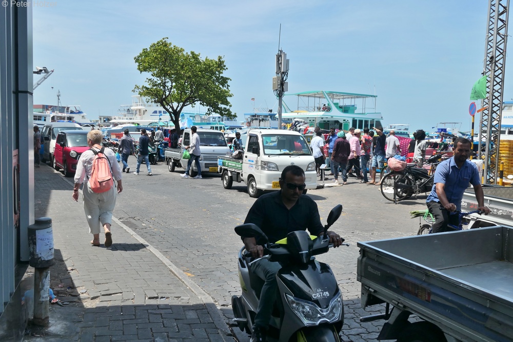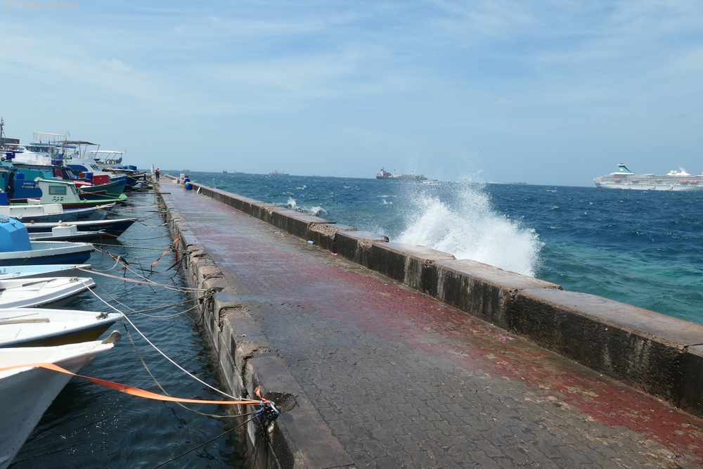 Über Nacht steuerten wir die Hauptinsel der Malediven Malé an. Hier liegt auch die gleichnamige Hauptstadt mit 155.000 Einwohnern. Allerdings konnten wir nicht pünktlich am Morgen um 11:00 Uhr den Anker werfen, da sich der Lotse, der uns zum Ankerplatz lotsen sollte, verspätet hatte.