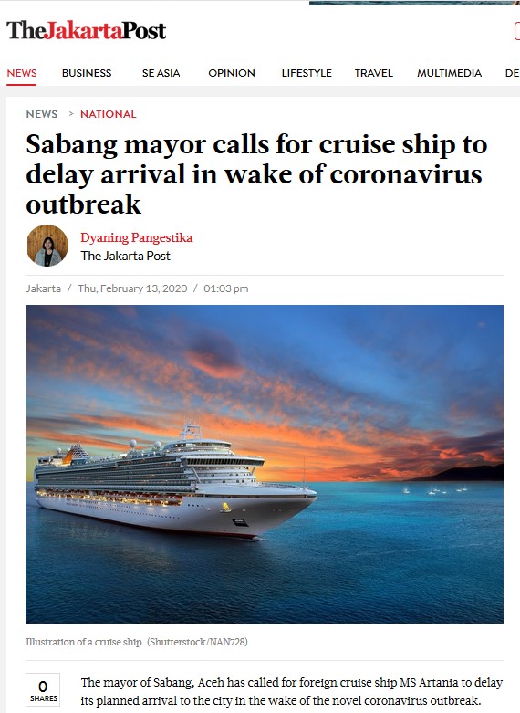 Der Bürgermeister von Sabang, Aceh, hat das ausländische Kreuzfahrtschiff MS Artania aufgefordert, seine geplante Ankunft in der Stadt nach dem Ausbruch des neuartigen Coronavirus zu verzögern.