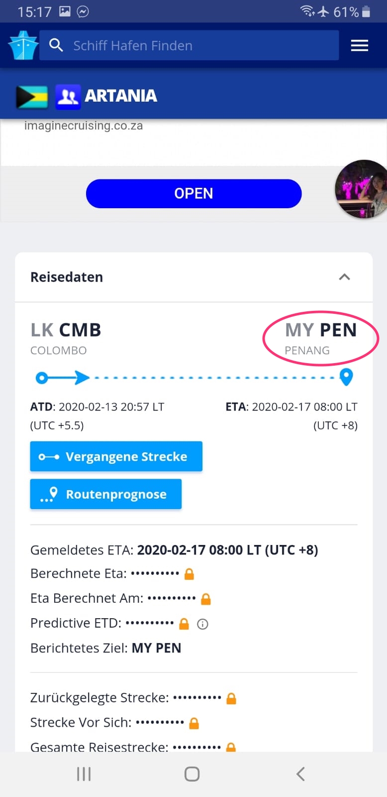 Die ARTANIA hat bereits das eigentlicher Ziel Sabang durch Penang/Malaysia ersetzt, wie man in der Marine Traffic App sehen kann. Dies bedarf zunächst keiner Kursänderung, es geht nach wie vor fast schnurstracks nach Osten.