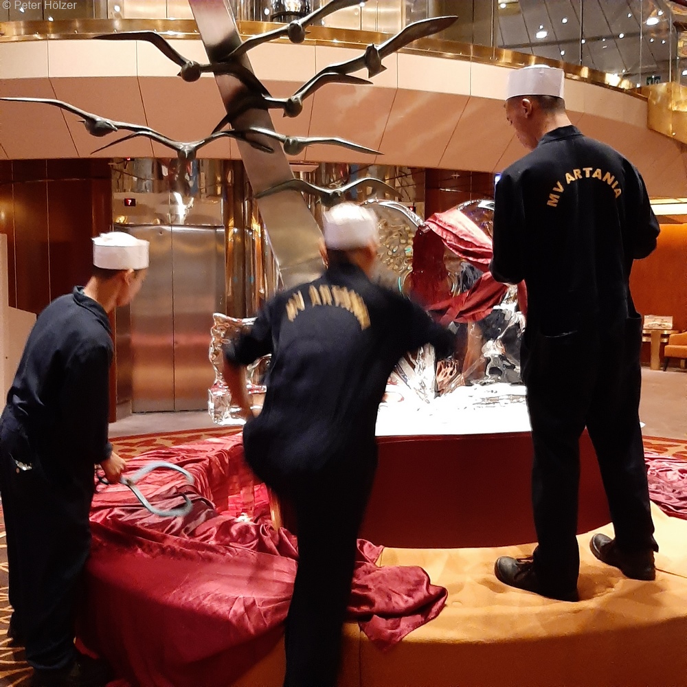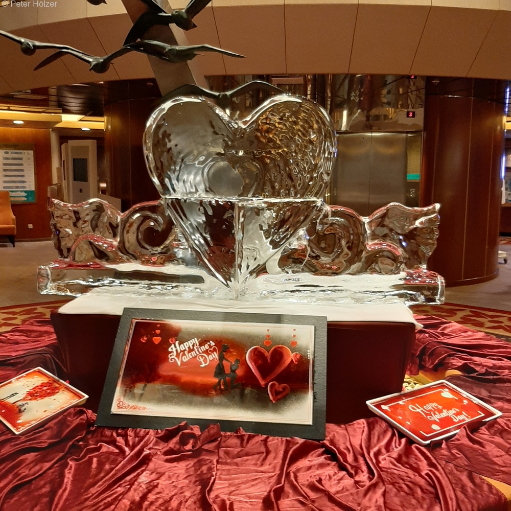 Ach ja, Valentinstag war ja heute auch. Im Foyer auf Deck 2 war eine „herzige“ Eisskulptur aufgebaut, vor der sich viele Mitreisende gerne fotografieren ließen.