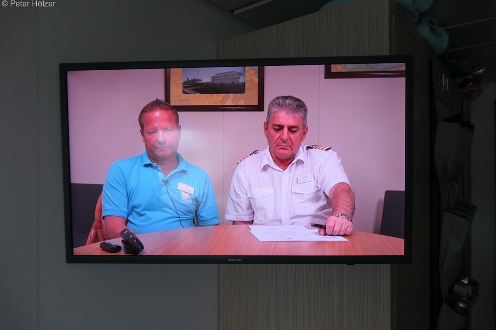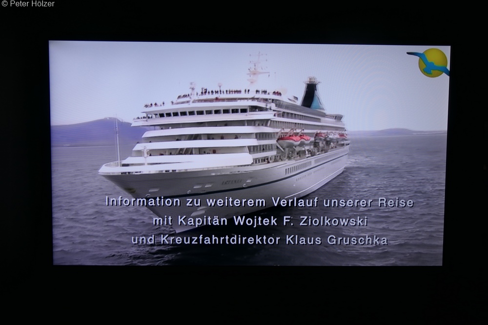 Heute gab es aber die Zusatzinformation, dass ab sofort auf Kanal 8 des Bordfernsehens von Kapitän und ihm selbst eine Erklärung zur notwendig gewordenen Routenänderung gesendet wird (in Dauerschleife).