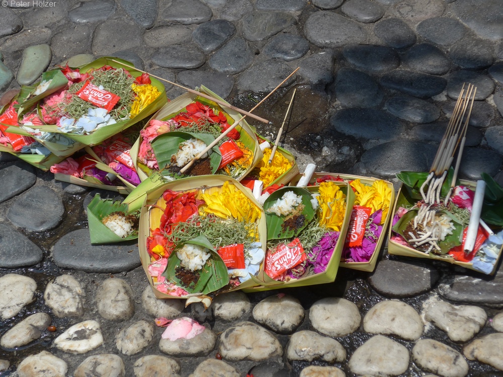 Diese kleinen Kästchen, hergestellt aus Palmblättern, gefüllt mit Opfergaben, werden überall platziert. Auf der Straße, vor Geschäften, in Bussen und Pkws, auf Hausaltären oder an den allgegenwärtigen Statuen.