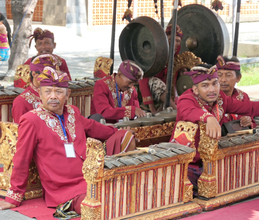 Begrüßt wurden wir von einem traditionellen Musik- und Tanzensemble. Zu den exotischen und für europäische Ohren sehr ungewöhnlichen Klängen eines Gamelanorchesters führten 6 Tänzerinnen klassische balinesische Tänze vor.