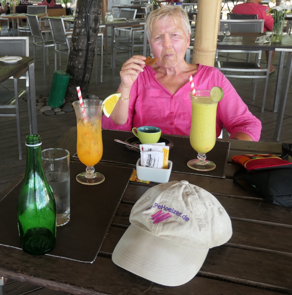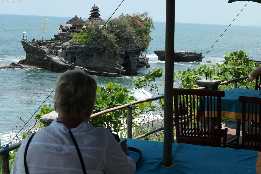 Jetzt am späten Vormittag war der Besucherstrom sehr übersichtlich. Die Restaurants, auf deren Terrassen man einen „unverbautem“ Blick auf die kleine Insel mit dem Tempel hat, waren so gut wie leer und wir konnten uns einen der Logenplätze aussuchen, um bei einem kühlen Getränk die Aussicht zu genießen. Da man hier anscheinend weder am Abend noch am Vormittag einen spektakulären Sonnenuntergang geboten bekommt, war so gesehen der Zeitpunkt unseres Hierseins optimal gewählt, da die vielen Busse ja erst am späten Nachmittag ankommen werden.