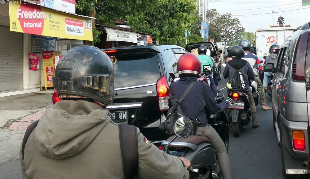 Die wichtigsten Voraussetzungen im balinesischen Straßenverkehr sind Geduld, stoische Ruhe und Gelassenheit. Es wird auch nur ganz wenig gehupt.