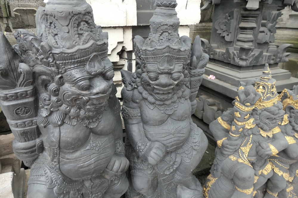 Da wir gestern mit unserer Tour mehr als zufrieden waren, hatten wir für heute unseren Fahrer wieder engagiert – Treffpunk zwischen 10:00 und 10:30 Uhr. Die vor dem Terminal wartenden Fahrer glaubten uns klein Wort, als wir ihre Angebote mit der Begründung ablehnten, dass wir bereits einen Deal mit einem Fahrer hätten. Einer heftete sich an unsere Fersen und ließ sich auch nicht abschütteln. Er begründete seine Hartnäckigkeit damit, dass er uns zu Diensten stünde, falls unser Fahrer uns versetzt haben sollte. Aber unser Fahrer war da, und als wir ihm mit unseren Regenschirmen winkten, trollte sich unser Schatten wieder. Die Regenschirme nahmen wir mit, da es heute früh schon kräftig geregnet hatte und wir mit dem balinesischen Regen nicht mehr ganz so hautnah erneut Bekanntschaft machen wollten.