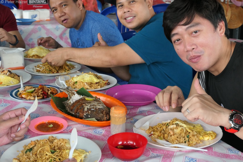 Nach dem Abendessen wollten wir noch ein wenig durch die Verkaufsbuden vor dem Terminal bummeln. Ein kleiner Rest von Fahrern wartete vor dem Terminal weiterhin auf Kundschaft. Ihre Warnungen vor dem „Big Rain“ und doch lieber mit ihnen eine Abendfahrt zu machen, ignorierten wir. Es waren ja nur wenige Schritte bis zu den Buden. Aber die wenigen Meter bis dorthin reichten vollkommen aus, als der Himmel ohne Vorwarnung seine Schleusen öffnete, um uns bis auf die Haut zu durchnässen. Bei einer Verkaufsbude fanden wir Unterschlupf. Und obwohl wir nur einen Kühlschrankmagneten für einen Dollar erstanden (ursprünglicher Preis 3 Dollar) bot man uns einen Stuhl an. Auch meine Idee, hier irgendwo noch eine Flasche des heimischen Biers (Marke Bintang) zu mir zu nehmen, musste ich erst einmal fallen lassen. Als der Schauer vorbei war, ging es schnurstracks zurück aufs Schiff.