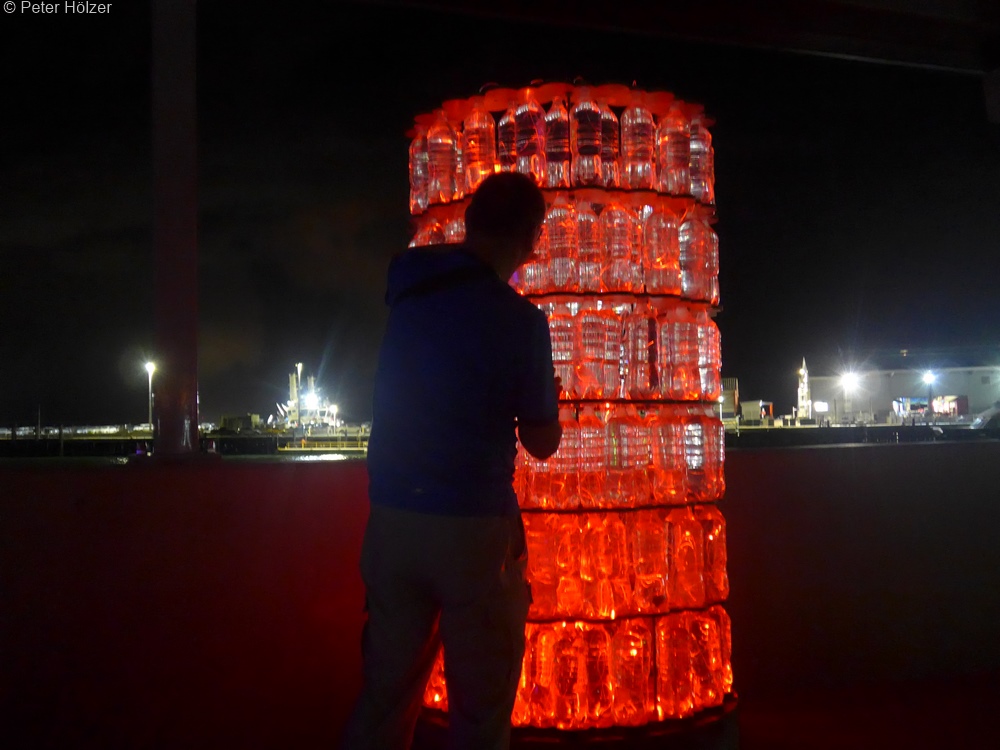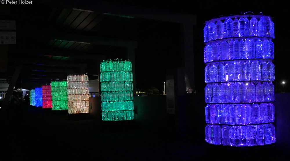 Fast wie der (gerade) Turm von Pisa. Eine pfiffige Idee: Petflaschen gefüllt mit Wasser. Das Ganze beleuchtet mit LEDs, die ihre Farbe wechseln.