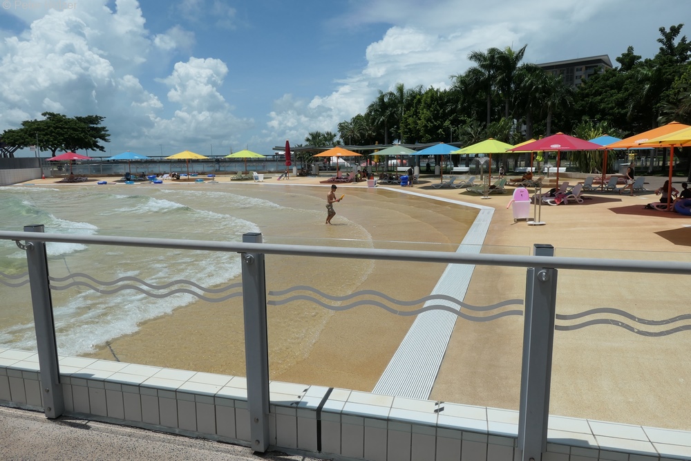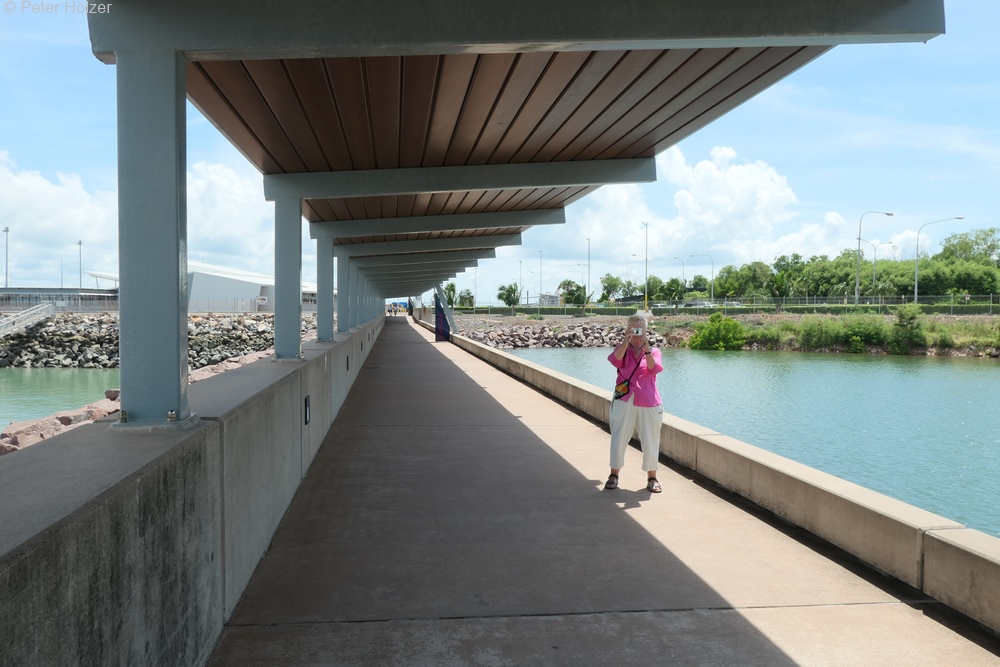 Schatten ist wichtig. An vielen Stellen in Darwin sind Sonnensegel oder Überdachungen vorhanden. So auch ein großer Teil des Weges von der Waterfront zum Schiff.
