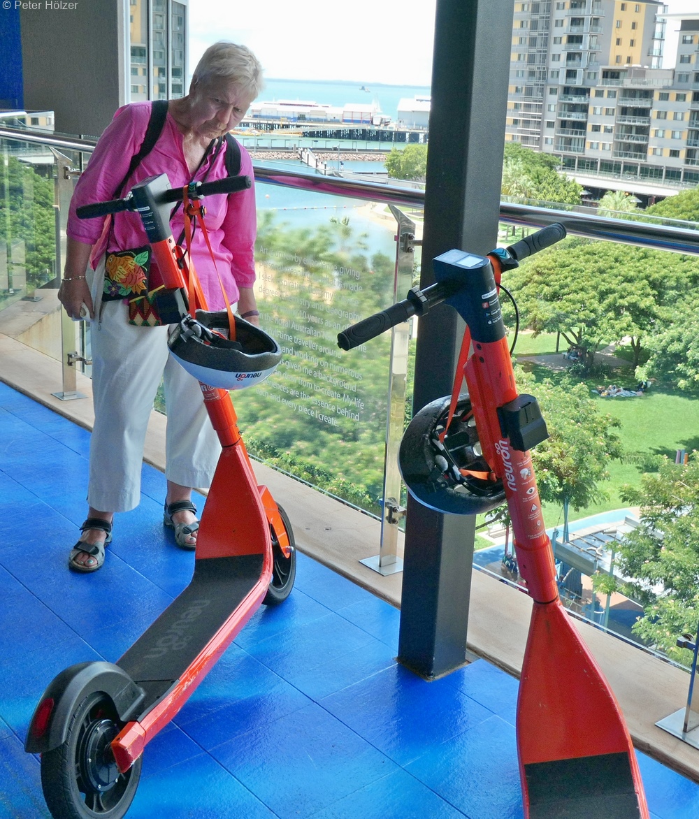 Auf der ARTANIA konnten wir erst mal in Ruhe die für das Freischalten der Scooter notwendige App auf unsere Smartphones laden und nachlesen wie man bezahlt (automatische Abbuchung per Paypal oder Kreditkarte durch die App) und wie das ganze Procedere zum Fahren überhaupt funktioniert und was es kostet. Ganz billig ist der Spaß nicht. Einen Dollar Grundgebühr plus 38 Cent für jede angefangene Minute. Da kommt man auf einen Stundenpreis von fast 24 $ (16 €) pro Person, in Summe für uns beide also 32 €. Dafür konnte man auf Bali 3 Stunden Taxi fahren. Aber was soll’s. Australien ist kein Billigland und zum Ausprobieren muss man ja nicht gleich so lange fahren.