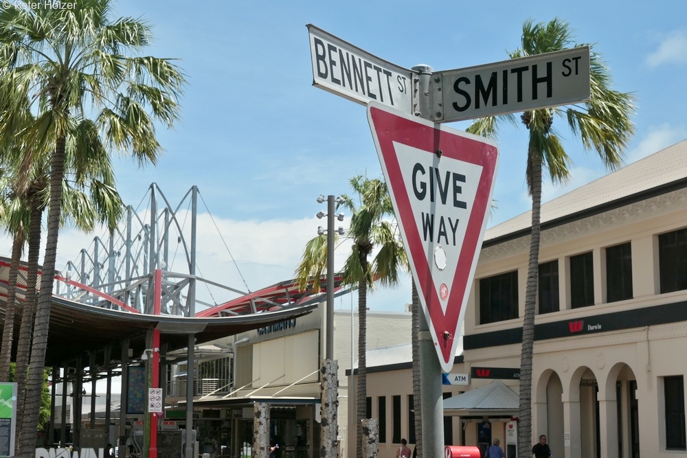 Die Zeit von November bis April, wird hier in dem Northern Territory die „Wet Season“ genannt, im Gegensatz zur „Dry Season“ während der restlichen Zeit im Jahr. Jetzt, zur Wet Season, ist es unerträglich heiß und äußerst schwül. Deshalb war es uns sehr recht, dass wir gleich am Anfang der Smith Street ein schattiges Plätzchen fanden, um eine Cola zu trinken und dem Straßenmusiker zuzuhören, der sich dort mit Mikrofon und Verstärker platziert hatte..