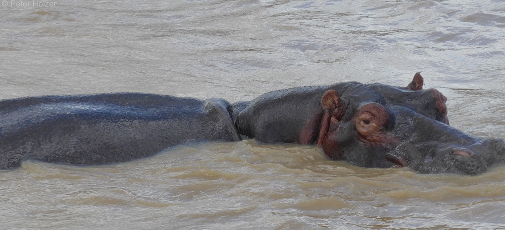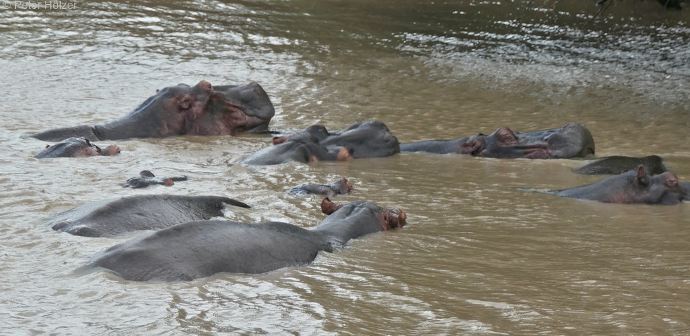 Später auf dem Schiff hörten wir die leise Klage, dass diese Tiere ja nicht in voller Größe zu sehen waren, sondern nur die Köpfe und Teile des Rumpfs. Klar, da konnte man im Hippo-Gehege im Frankfurter Zoo mehr sehen (als Flusspferdbulle Maikel noch lebte). Aber dazu muss man wissen, dass die Flusspferde eine sehr empfindliche Haut haben und sehr leicht Sonnenbrand bekommen und deshalb bei Sonnenschein (gibt es in Afrika öfter als in Frankfurt) lieber unter als über Wasser sind.