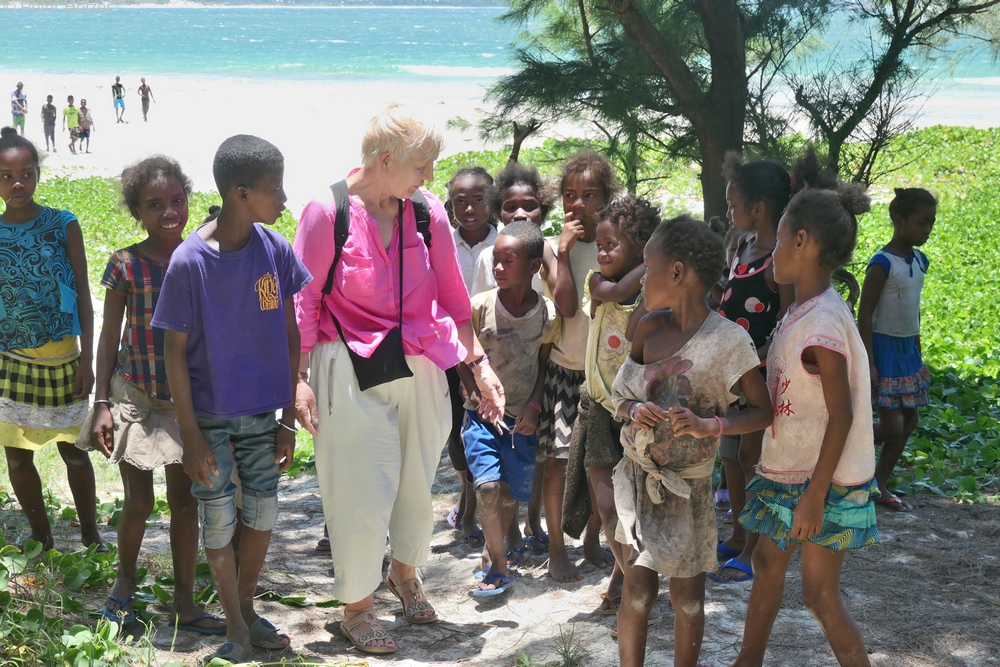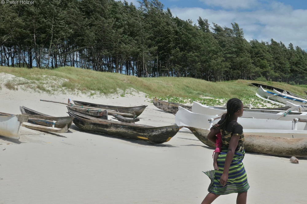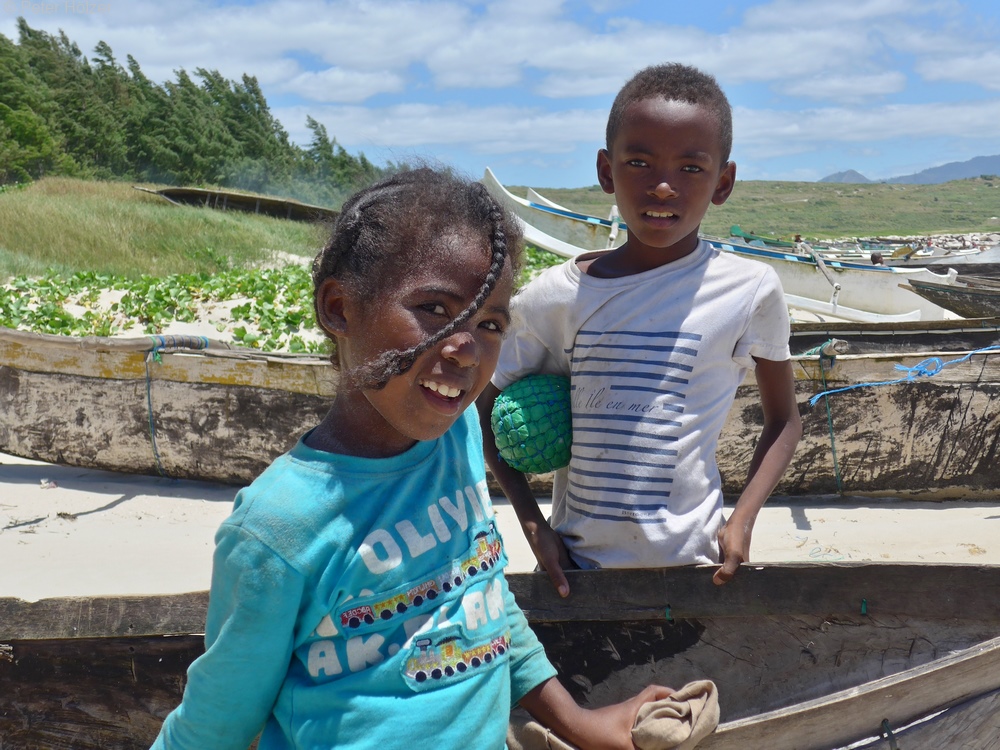 Wir setzten uns auf den Rand eines der vielen hier am Strand liegenden Boote und mussten nicht lange warten bis sich drei oder vier Kinder zu uns gesellten und neugierig beäugten. Wir packten einige der Täfelchen aus und gaben sie den Kids, die sie begeistert entgegennahmen.