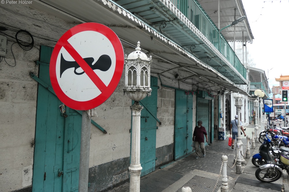 Den im Reiseführer erwähnten und empfohlenen Place d’Armes hatten wir gestern zufällig gefunden und schnell wieder verlassen, denn außer auf den Grünflächen dieses Platzes sind Fußgänger unerwünscht und stören nur. Hier kreuzen sich wohl alle wichtigen Straßen von Port Louis und die Straßen sind total verstopft. Die Bürgersteige sind mit Absperrgittern von den Fahrbahnen getrennt und es gibt nur wenige Stellen, wo man die Fahrbahnen überqueren kann.