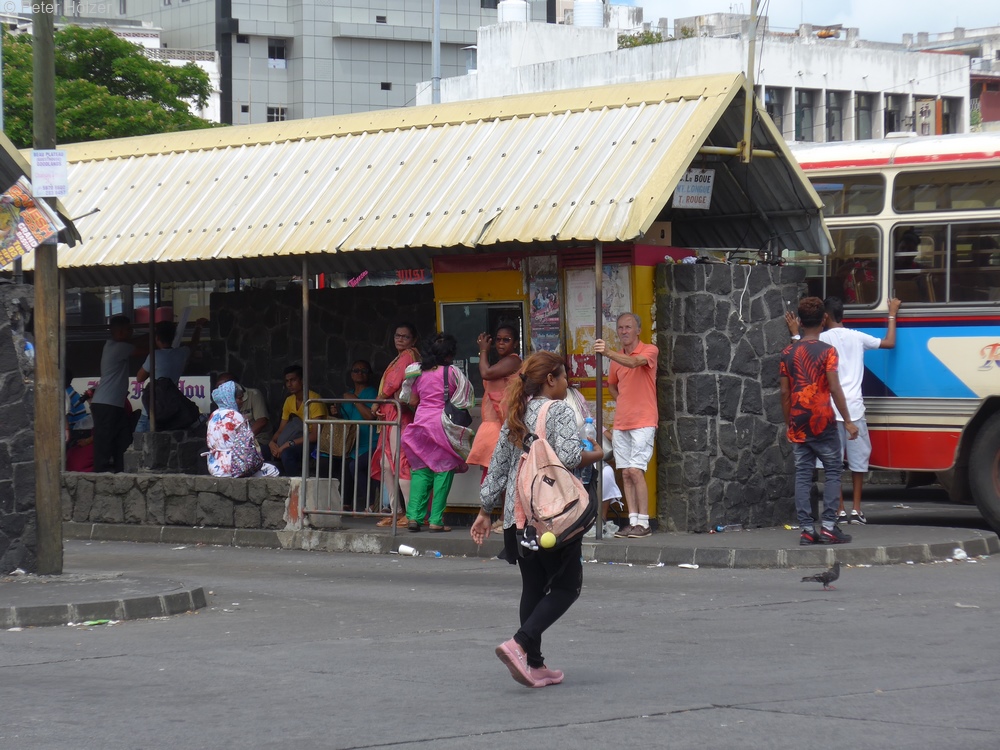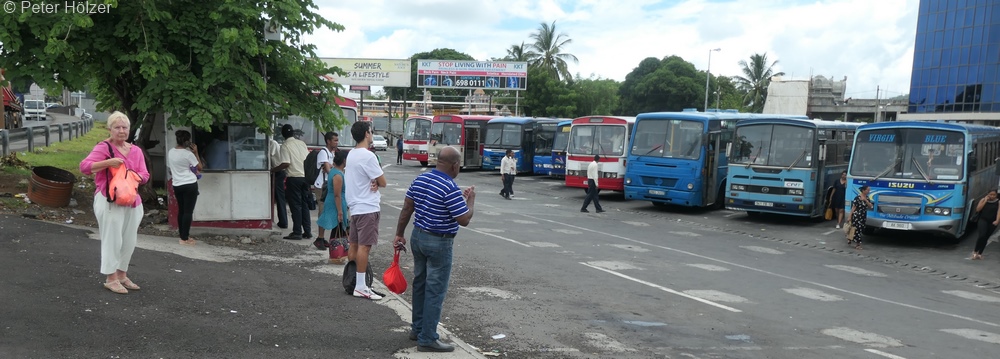 Das befreundete Ehepaar, mit dem wir die Überlandtour in Namibia bestritten hatten, gab uns wertvolle Informationen, wie man mit dem Linienbus für ganz kleines Geld nach Grand Baie fahren konnte. Dort sollen sich laut Reiseführer die schönsten Strände von Mauritius befinden. Alle halbe Stunde fährt die Linie 215 dorthin und wieder zurück. 2 Personen zahlen 3 US-Dollar für die einfache Strecke. Gewappnet mit dieser Information brachen wir auf. Die Wartezeit im Wassertaxi war heute erträglich und nach dem Übersetzen zur Waterfront brauchten wir nur gut 5 Minuten zu Fuß bis zum großen Busbahnhof.
