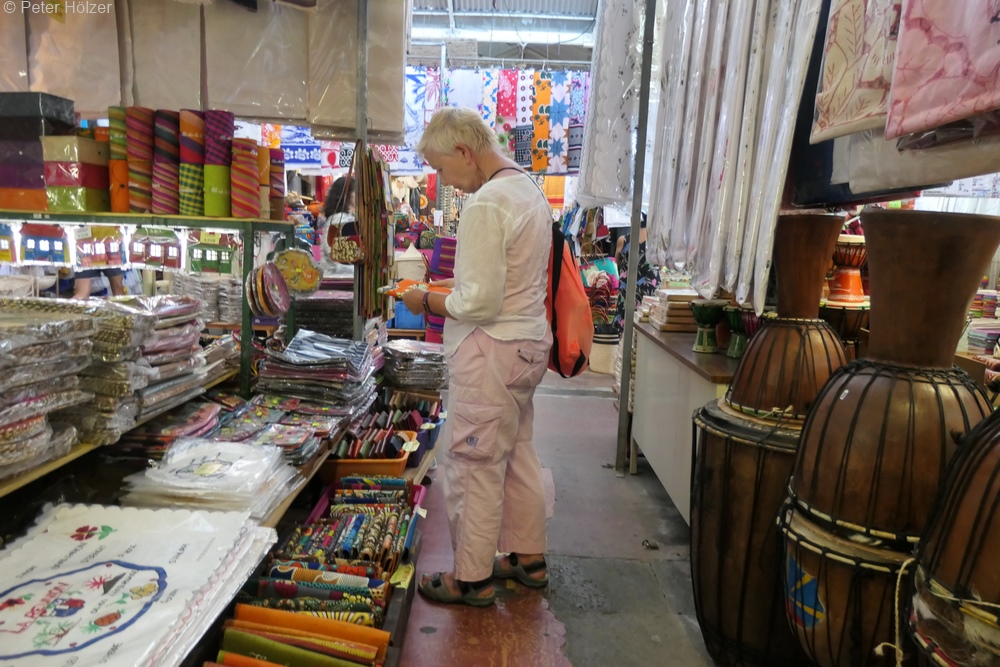 Der Grand Marché bot Souvenirs aus Holz, Bast, aber auch bunte Textilien. Dabei handelte es sich weniger um Kunsthandwerk, sondern die Waren entstammten aus industrieller Massenproduktion.